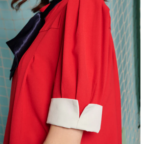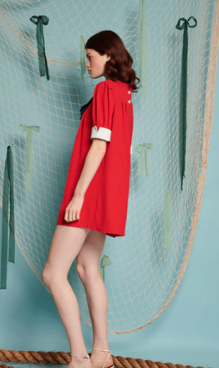 Set sail in style with the Ahoy Pleated Mini Dress, a nod to nautical chic with a playful twist. The soft crepe fabric and oversized fit offer effortless elegance, while the pleated bodice and contrast cuffs add a touch of texture and fun. Finished with a satin ribbon necktie and sparkling gem buttons.