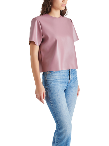 Smooth and shiny faux leather adds the edginess you crave to a boxy-cut top framed by short sleeves.